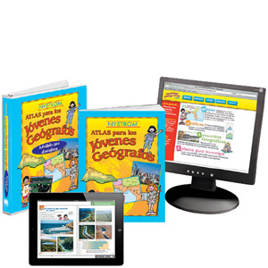 The first half of the atlas focuses on building geographic skills, and the second half of the atlas applies those skills to the study of U.S. regions. U.S. and world physical and political maps are also included. Throughout the atlas, text and place names on the maps are in Spanish. The correlated student activities provide reproducible activity handouts for every two-page spread in the atlas, with student handouts and answer keys in Spanish. A 5-year digital subscription to the atlas is good for one teacher and all that teacher’s students. The atlas pack combines 30 Spanish atlases, one reproducible student activity book, and the 5-year digital subscription to the atlas and its student activities.