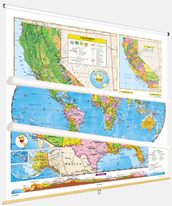 Inset graphs and/or thematic maps provide information about such topics as population, land use, growing seasons, or other topics important to your state. Three configurations are available: one state map; a state, U.S., and world map combination set; and a state, U.S., world map combination with a 16″ political raised-relief globe. The U.S. and world are political relief maps. Each wall map or map set comes mounted on a single heavy-duty spring roller with a backboard, and all the maps are markable/erasable with water-soluble markers. All roll-down maps and map sets must be attached to the wall by means of a map rail or map rack (not included).