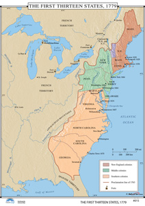 Twelve maps: European Exploration of North America o Atlantic Slave Trade Routes o English Colonial Settlements, 1600s o Native American Indian Nations, c. 1750 o Colonial Overseas Trade, 1740 o French, Spanish, and English Settlements to 1776 o The French and Indian War, 1754–1763 o The Revolutionary War in the North and West, 1776–1780 o The Revolutionary War in the South, 1778–1781 o The First Thirteen States, 1779 o Land Ordinance of 1785 o Northwest Territory, 1787