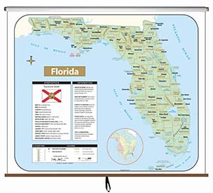 This full-color state map includes shaded-relief topography, county names and borders, major and capital cities, main rivers, and other large bodies of water. It includes insets providing a state flag, a locator map (within North America), a table of statistics, and text with high-interest historical, anecdotal, and geographical information. The single state map comes on a spring roller mountable on a one-inch map rail (already present in many classrooms) or on a backboard. The combo sets comprises one state map plus political maps of the United States and the world, and is also mounted on a spring roller that may require a backboard. The pack of 50 laminated, unlabeled outline maps (8½" x 11") shows rivers, bodies of water, and counties, and include latitude and longitude.