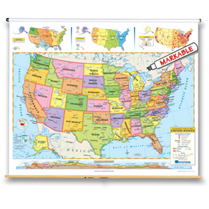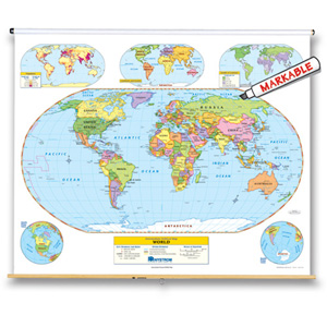 Both show shaded relief, capital and major cities (with type size denoting population), and include longitude and latitude. Inset thematic maps show the world’s continents and oceans, north and south polar views, population, and wealth, and the U.S.’s population, time zones, growth through time, and a cross-section elevation profile. Other U.S. map insets show Alaska, Hawaii, and a locator map. Both maps measure 53″h x 65″w and are mounted together on one heavy-duty metal spring roller with a backboard.