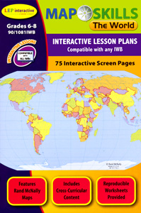 For example, touch a country to see photographs, video, or statistics; calculate the coordinates of a country’s capital by pointing to its location; explore an ocean’s depths by tapping it with a digital pen. Seven interactive lesson plans—each with about 75 screens—cover the world and six regions through a wide variety of activity pages and full-color maps by Rand McNally that engage students in actively learning important map skills and distinctive geographic features—from latitude, longitude, and cardinal directions to countries, climates, and natural resources. For use on IWBs, projectors, tablets, slates, PC, and Mac.