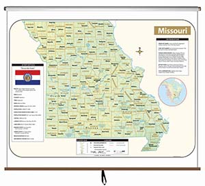 This full-color state map includes shaded-relief topography, county names and borders, major and capital cities, main rivers, and other large bodies of water. It includes insets providing a state flag, a locator map (within North America), a table of statistics, and text with high-interest historical, anecdotal, and geographical information. The single state map comes on a spring roller mountable on a one-inch map rail (already present in many classrooms) or on a backboard. The combo sets comprises one state map plus political maps of the United States and the world, and is also mounted on a spring roller that may require a backboard. The pack of 50 laminated, unlabeled outline maps (8½" x 11") shows rivers, bodies of water, and counties, and include latitude and longitude.