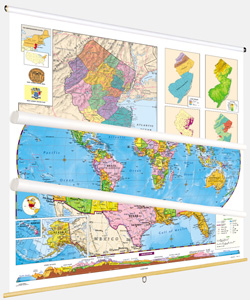 Inset graphs and/or thematic maps provide information about such topics as population, land use, growing seasons, or other topics important to your state. Three configurations are available: one state map; a state, U.S., and world map combination set; and a state, U.S., world map combination with a 16″ political raised-relief globe. The U.S. and world are political relief maps. Each wall map or map set comes mounted on a single heavy-duty spring roller with a backboard, and all the maps are markable/erasable with water-soluble markers. All roll-down maps and map sets must be attached to the wall by means of a map rail or map rack (not included).