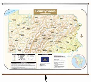 This full-color state map includes shaded-relief topography, county names and borders, major and capital cities, main rivers, and other large bodies of water. It includes insets providing a state flag, a locator map (within North America), a table of statistics, and text with high-interest historical, anecdotal, and geographical information. The single state map comes on a spring roller mountable on a one-inch map rail (already present in many classrooms) or on a backboard. The combo sets comprises one state map plus political maps of the United States and the world, and is also mounted on a spring roller that may require a backboard. The pack of 50 laminated, unlabeled outline maps (8½" x 11") shows rivers, bodies of water, and counties, and include latitude and longitude.