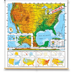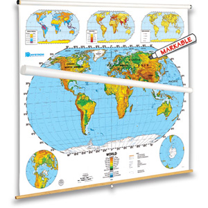 Melding elevation information with detailed shaded relief and political boundary lines, the pack equips students to understand physical geography and its political implications. Also shown: longitude and latitude, capital and major cities (with populations indicated by both type size and symbol size), and various types of landforms and water features. The maps add further dimensions with thematic insets showing, for the world, annual rainfall, population, and energy resources, and for the U.S., annual rainfall, population, agriculture, growing seasons, and a cross-section elevation profile. Both maps measure 54"h x 65"w, and come mounted on one heavy-duty metal spring-roller with a backboard designed for hanging from a map rack or a map rail, and the 16" 3-D raised-relief globe comes in a Gyro-disc mount.