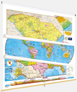 Inset graphs and/or thematic maps provide information about such topics as population, land use, growing seasons, or other topics important to your state. Three configurations are available: one state map; a state, U.S., and world map combination set; and a state, U.S., world map combination with a 16″ political raised-relief globe. The U.S. and world are political relief maps. Each wall map or map set comes mounted on a single heavy-duty spring roller with a backboard, and all the maps are markable/erasable with water-soluble markers. All roll-down maps and map sets must be attached to the wall by means of a map rail or map rack (not included).